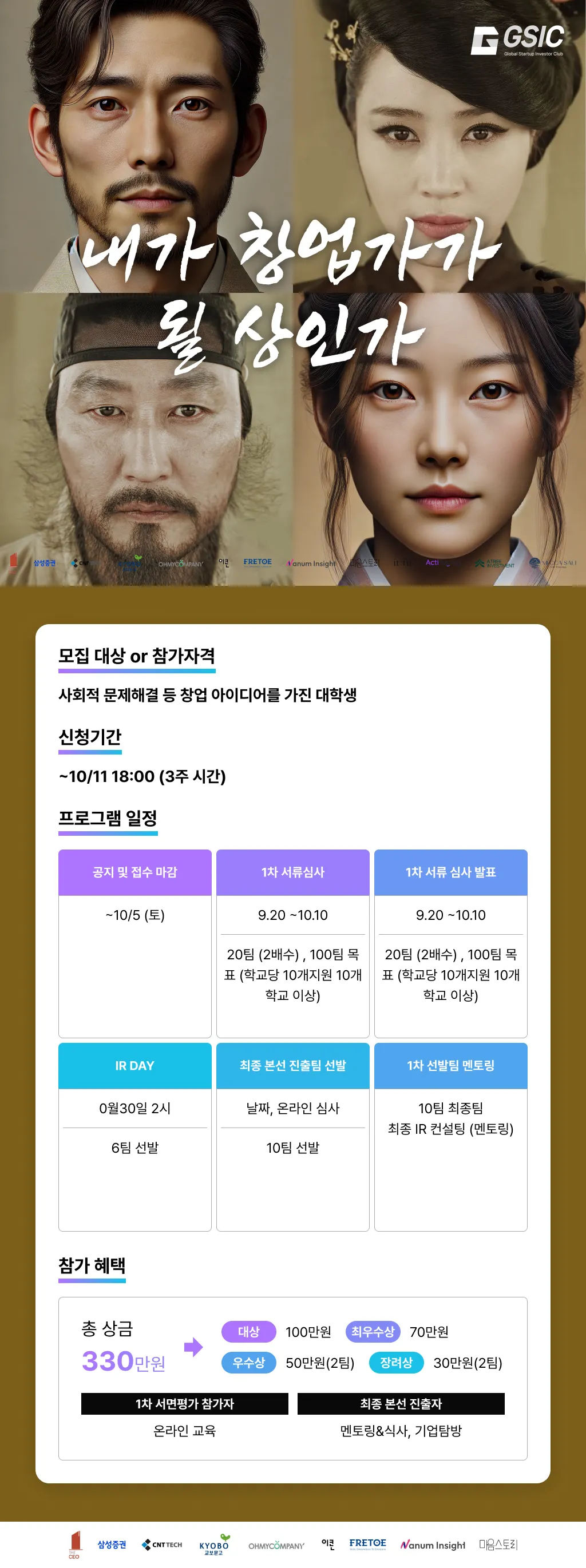 - 330만원 (상금 330만원 , 대상 100 최우수상 70 우수상 50(2팀), 장려상 30(2팀) —> 총 6팀)